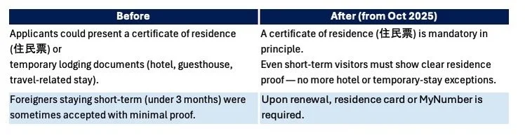 Q1: No. After October 2025, only residents with a valid address certificate (住民票) can apply. Hotel stays or temporary accommodations are no longer accepted.