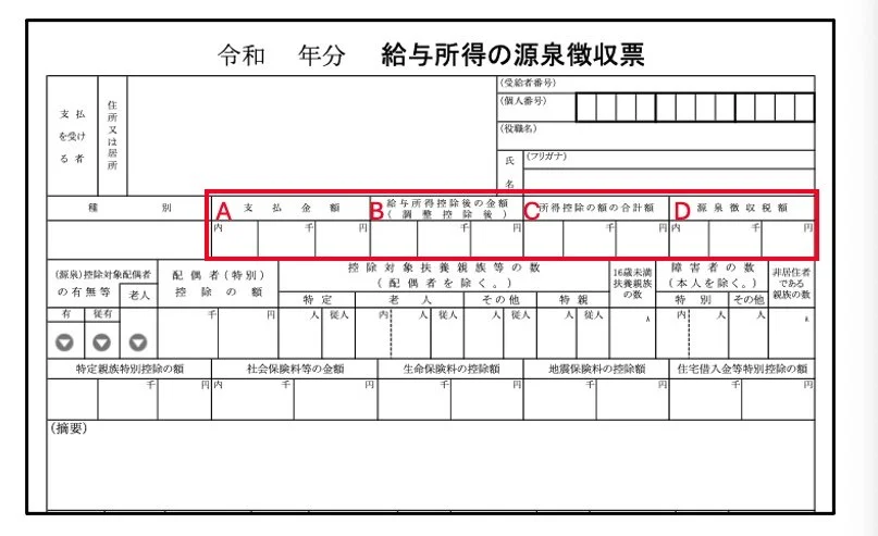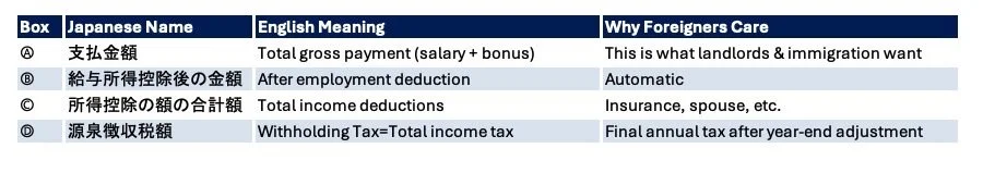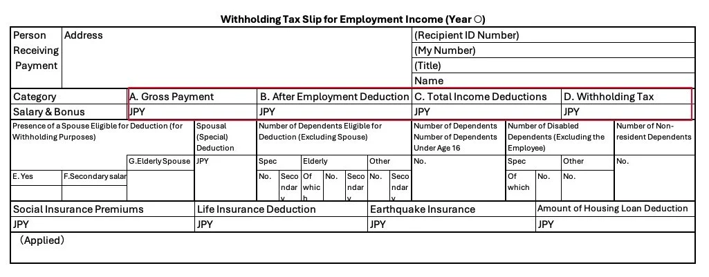 D. Withholding Tax Amount (源泉徴収税額):After year-end adjustment, this number becomes your final income tax amount for the year. If too much tax was withheld, you receive a refund. If too little was withheld, you will need to pay the difference.