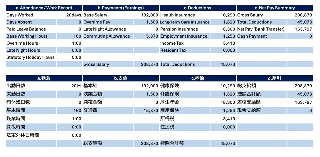 The sample chart below shows a typical payslip layout in both English and Japanese so you can visually match what appears on your own statement.