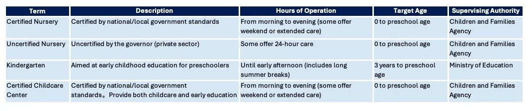 Hoikuen (保育園): Nursery schools for children from a few months old to preschool age. These are primarily designed for households where both parents work. Enrollment is especially competitive for the 0–1 year age group, particularly in urban areas. It's not uncommon for families to be unable to secure a spot at their preferred nursery.