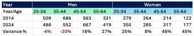 The chart illustrates percentage changes in full-time employment by age and gender (2014–2024), revealing clear divergence across groups.