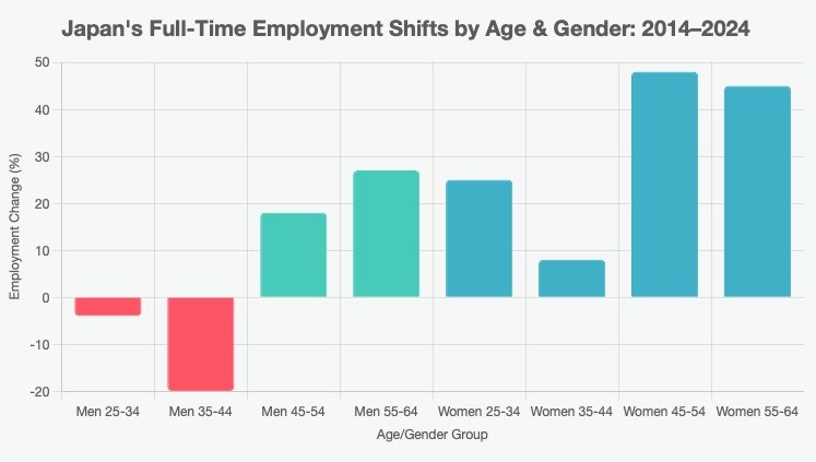 The most notable shift is the sharp decline in prime-age men, particularly those aged 35–44, who have traditionally formed the core of Japan’s corporate workforce.