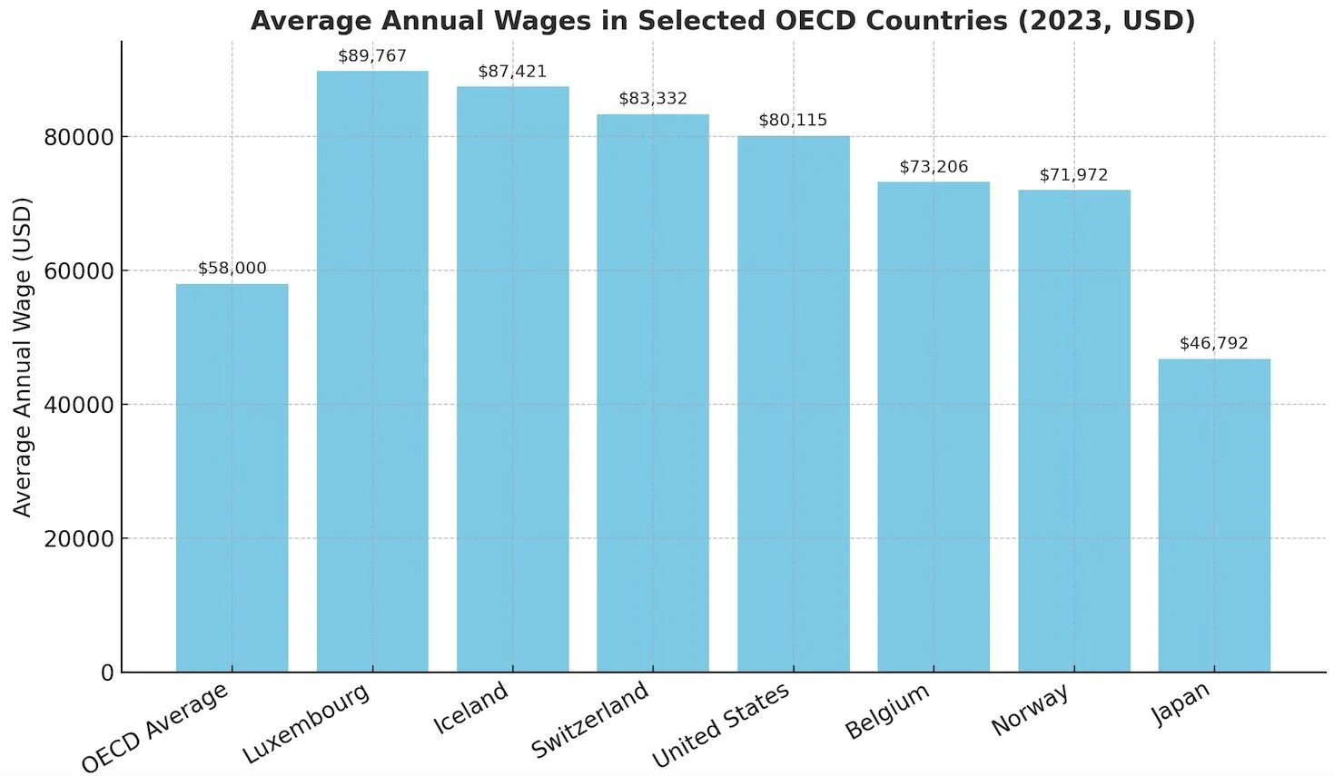 Moving to Japan often comes with salary shock. OECD data shows Japan’s average annual salary at around USD 46,792 (26th place), well below the OECD average (USD 58,000) and far behind countries like Luxembourg (USD 89,767) or the U.S. (USD 80,115). See the top 6 rankings + Japan below.