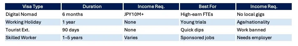 Japan’s Digital Nomad Visa (NEW 2024) offers 6-month stays for high-income earners.