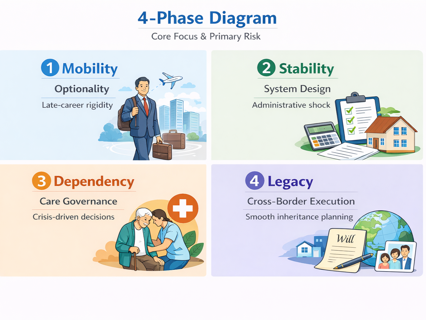 Foreign retirees navigating Japan long-term require specialized support for cross-border legal, financial, and administrative systems — from Mobility-phase job/visa transitions through Legacy-phase inheritance and guardianship.