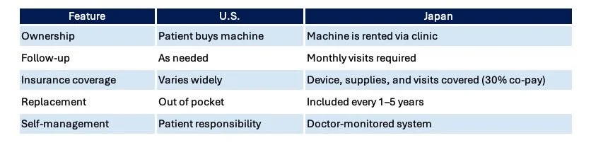 Compared to the U.S., Japan’s system emphasizes medical supervision rather than patient self-management. For many, this means fewer worries—your therapy is supported and maintained long-term.